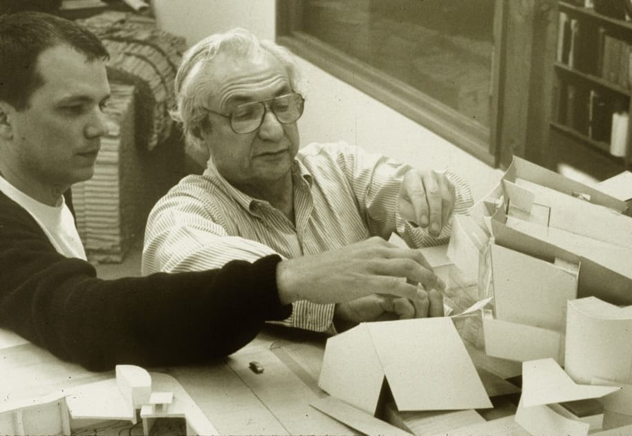 This photograph of a young Michael Maltzan working with Frank Gehry on a Disney Hall model, circa 1990, was included in the “Music for Frank” program