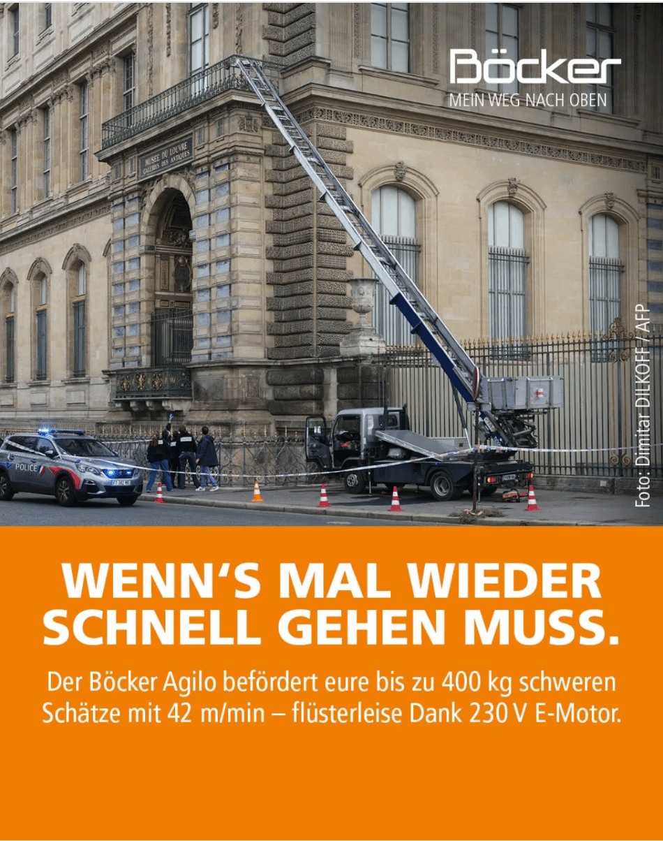 An Instagram post by Böcker, the German company that makes the mechanized ladder used in the heist. Translation: “When things need to move quickly”