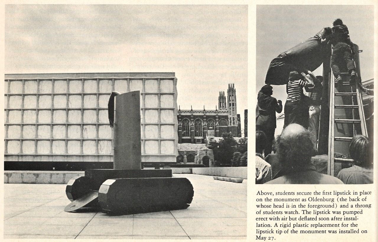 An item in the Yale Alumni Magazine, June 1969, showing Oldenburg’s Lipstick as originally installed (and initially limp) in front of Beinecke Library, quite near the location of the most pivotal scenes in “After the Hunt”