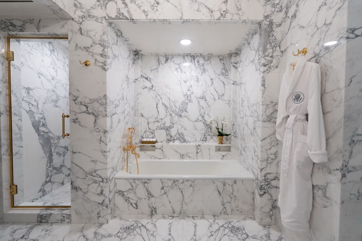 The president only bolstered that sense by hosting a Great Gatsby-themed ball at Mar-a-Lago on Halloween night—and by announcing, just four days before Election Day, that he’d added the Lincoln bathroom to his list of architectural conquests, giving it a makeover that brings to mind Maurico Cattelan’s “America,” an artwork in the form of an operable toilet made of 18-carat solid gold, while on an aspirational scale ranking somewhere between a Grand and a Park Hyatt: