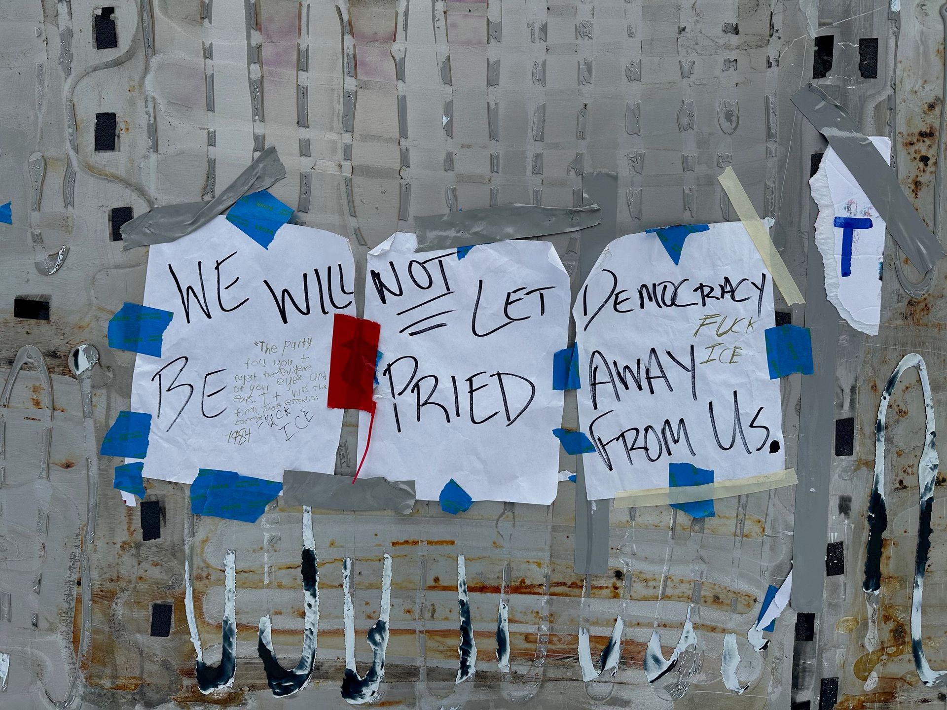 The President’s House, as it looks now, can be accurately described as scarred. And it is stirring up some raw emotions. Taped to the wall where one of the larger panels had been hanging, I saw a hand-drawn sign reading, “We will not let democracy be pried away from us.” Just after snapping a picture of that message, I came upon a man in tears. Another man walked up two minutes later, fuming and cursing under his breath. “We are going to need a national holiday when this fucker…” He trailed off, but it wasn’t hard to guess who he was talking about.