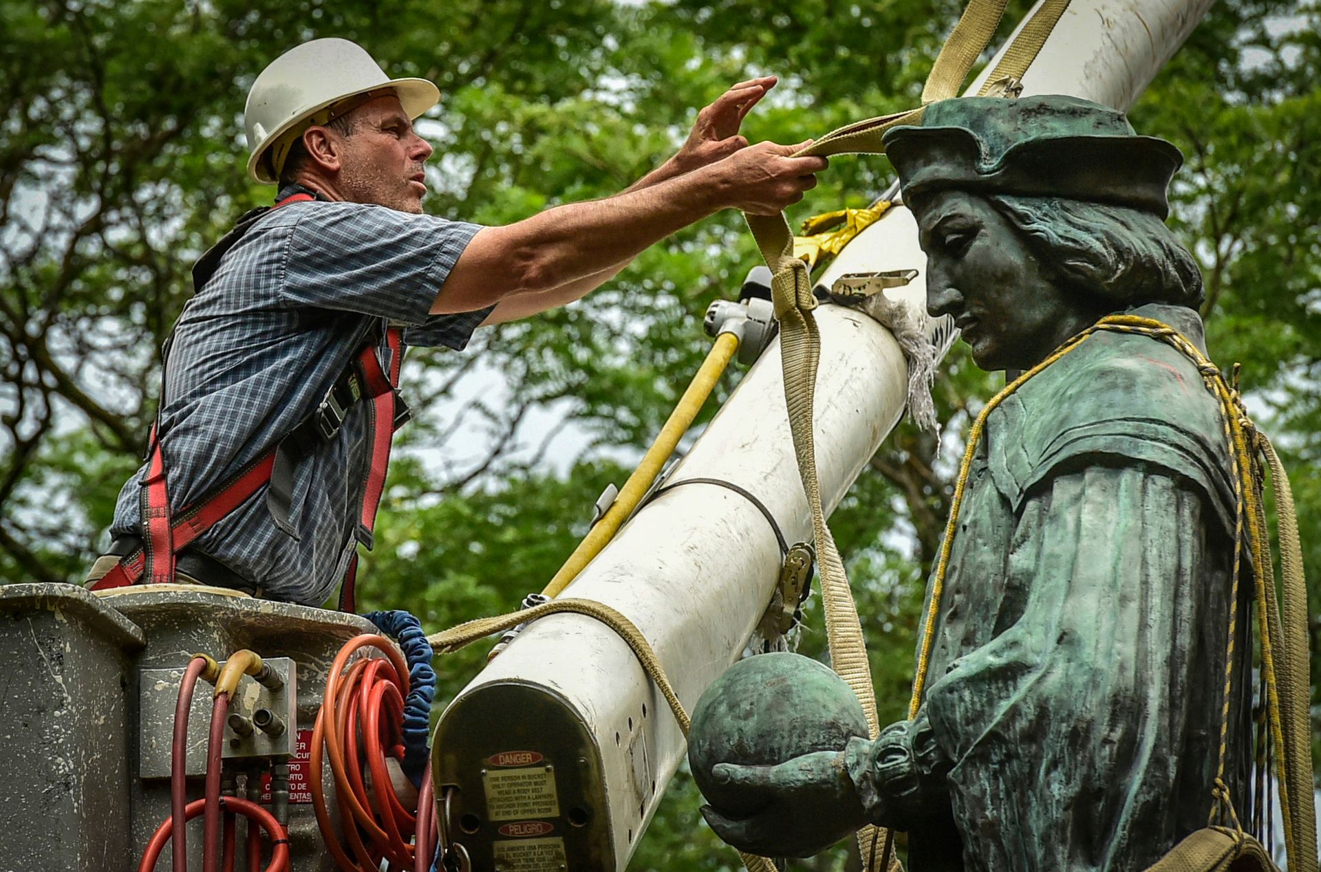 A city worker prepares to remove the statue of Christopher Columbus from New Haven’s Wooster Square Park on June 24, 2020. Peter Hvizdak/Hearst Connecticut Media; digital license via AP