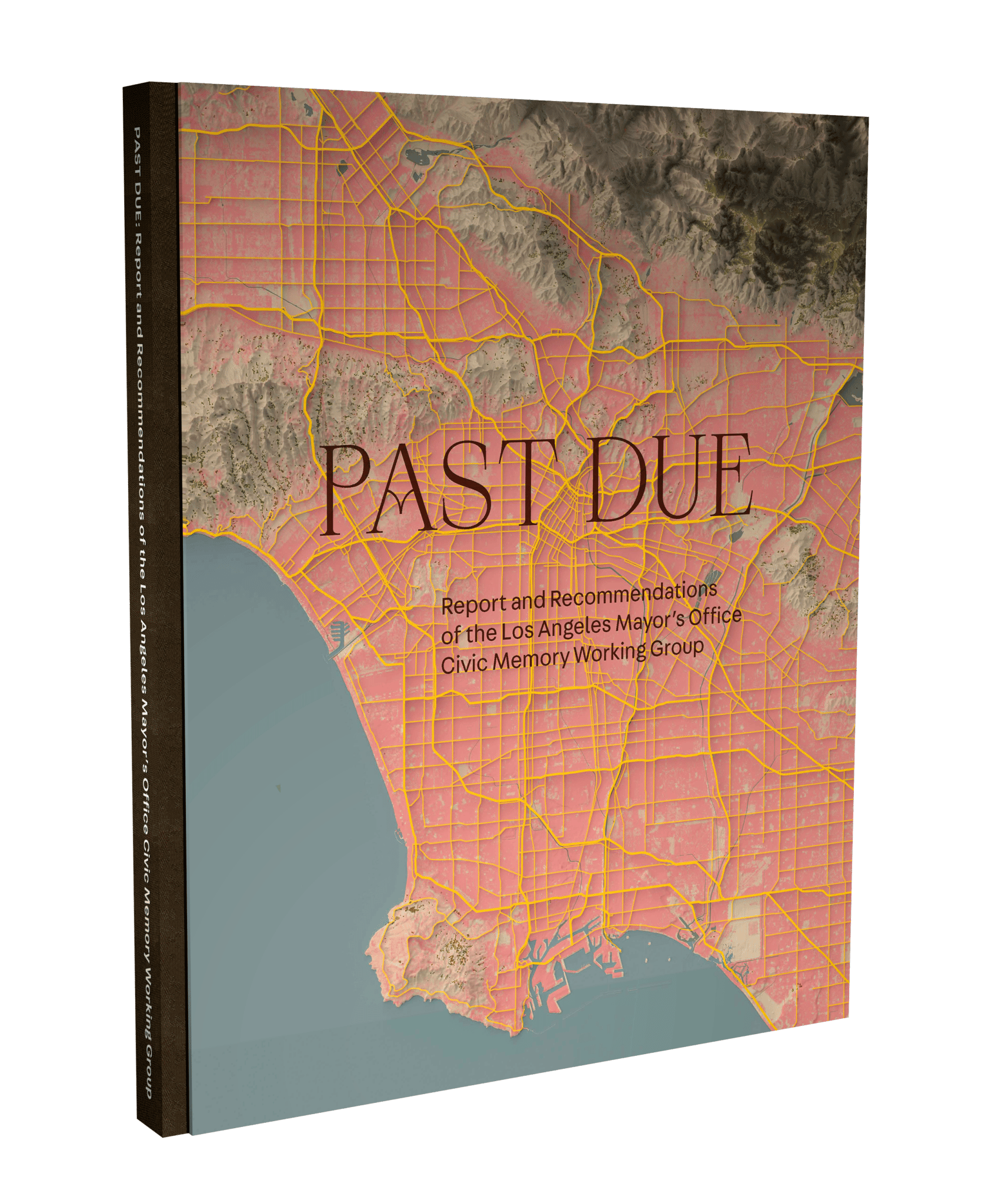 The cover of the 2021 Past Due report, with recommendations from the Los Angeles Mayor’s Office Civic Memory Working Group. Design by Polymode; cover image by Scott Reinhard