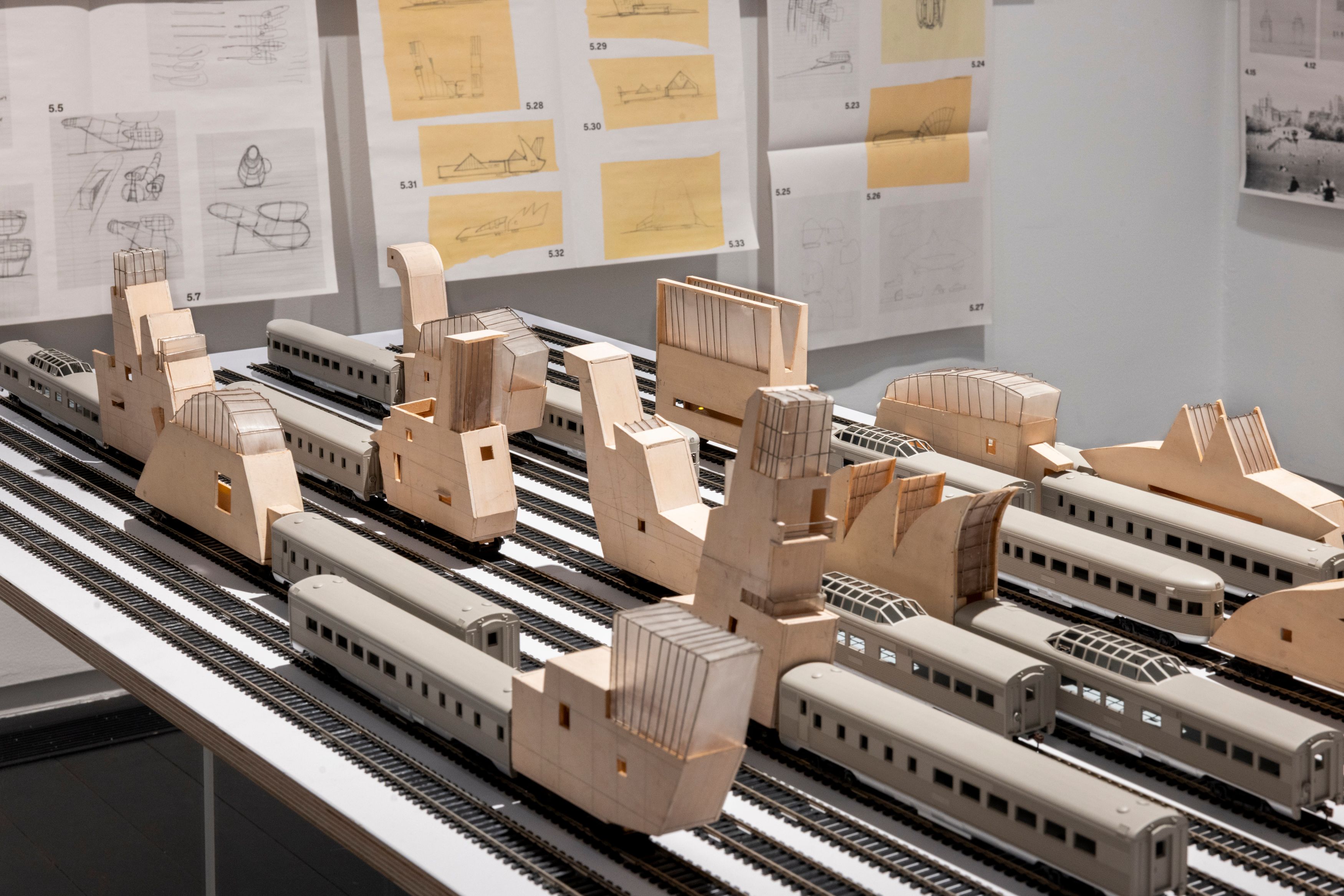 A model of Sorkin Studio’s “Tracked Houses,” 1990. Sorkin described these as “polemical houses” that were “inspired by the plight of a community of homeless people living in a railway tunnel and abandoned rail yard on the west side of Manhattan” and “intended to evoke the constrained nomadism of this rejected population.” Model courtesy Joan Copjec. Photograph courtesy of Drawings and Archives, Avery Architectural & Fine Arts Library, Columbia University
